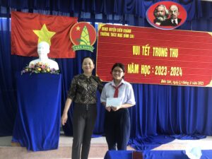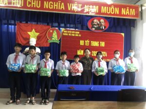 Cô Đặng Thị Hồng Phượng – Phó Hiệu trưởng nhà trường đại diện trao tặng đến các em có hoàn cảnh khó khăn một số phần quà động viên tinh thần học tập cho các em.