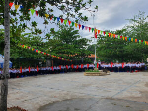 Tiếp đến là lễ chào cờ. Bài hát Quốc ca vang lên trong không khí trang nghiêm, hào hùng.
