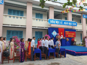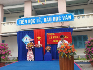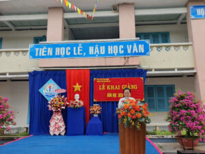 Cô Đặng Thị Hồng Phượng – Phó Hiệu trưởng nhà trường đọc diễn văn khai giảng và đánh trống để bắt đầu năm học mới 2024 – 2025.