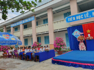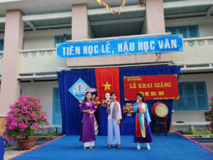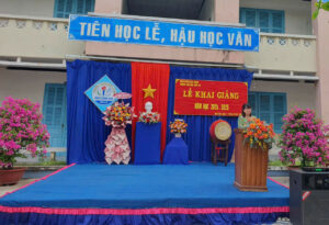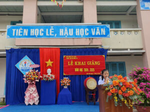 Cô Đặng Thị Hồng Phượng – Phó Hiệu trưởng nhà trường đọc diễn văn khai giảng và đánh trống để bắt đầu năm học mới 2024 – 2025.